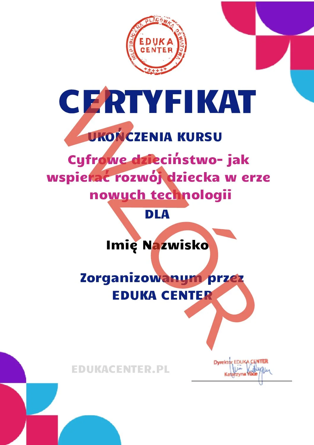Współczesne dzieci dorastają w świecie, w którym nowe technologie są nieodłącznym elementem codzienności. To stawia przed rodzicami, nauczycielami i opiekunami wyjątkowe wyzwania, ale też daje ogromne możliwości rozwoju. Kurs „Cyfrowe dzieciństwo” został stworzony, aby pomóc dorosłym świadomie wspierać rozwój dzieci w wieku przedszkolnym i wczesnoszkolnym, wykorzystując wiedzę z zakresu neurobiologii, psychologii rozwojowej oraz nowoczesnych narzędzi edukacyjnych.