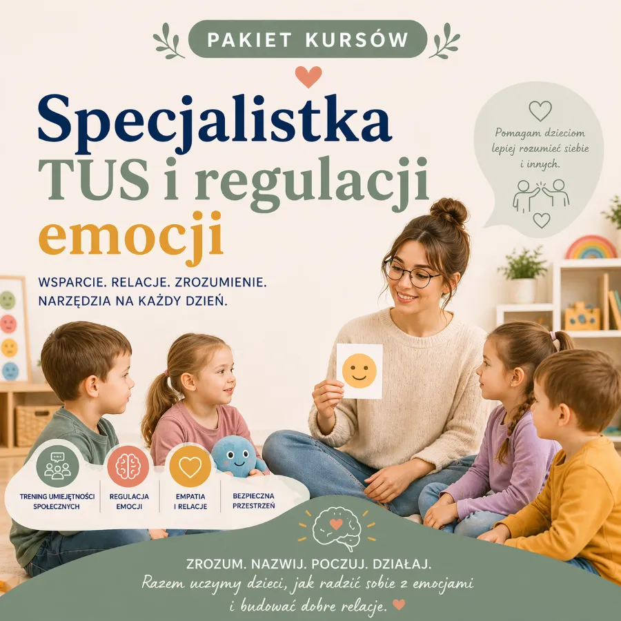To nie jest pakiet dla każdej nauczycielki — i właśnie w tym tkwi jego siła. Ścieżka „Specjalistka TUS i regulacji emocji” została stworzona dla osób, które chcą wejść poziom wyżej: nie tylko lepiej reagować na trudności dzieci, ale świadomie prowadzić bardziej zaawansowaną pracę wychowawczą, społeczną i profilaktyczną.